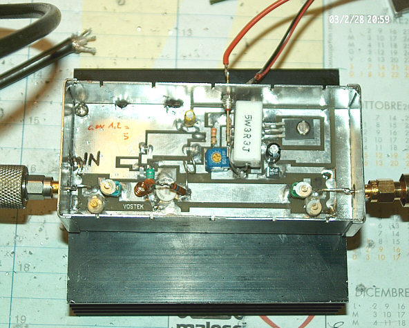Amplifier must be installed on the heat sink large enough to dissipate the heat from transistor. BLW98 transistor for ex. needs 26 V DC supply with a constant current of 1 A. The complete board must be installed in the metal - tuner type box, completely shielded with a lid (top cover) With 800 mW of RF input power CW this amplifier was able to give 4 W output power. 1.1W input power will give over 5 W of RF output power. For more info please contact authors.